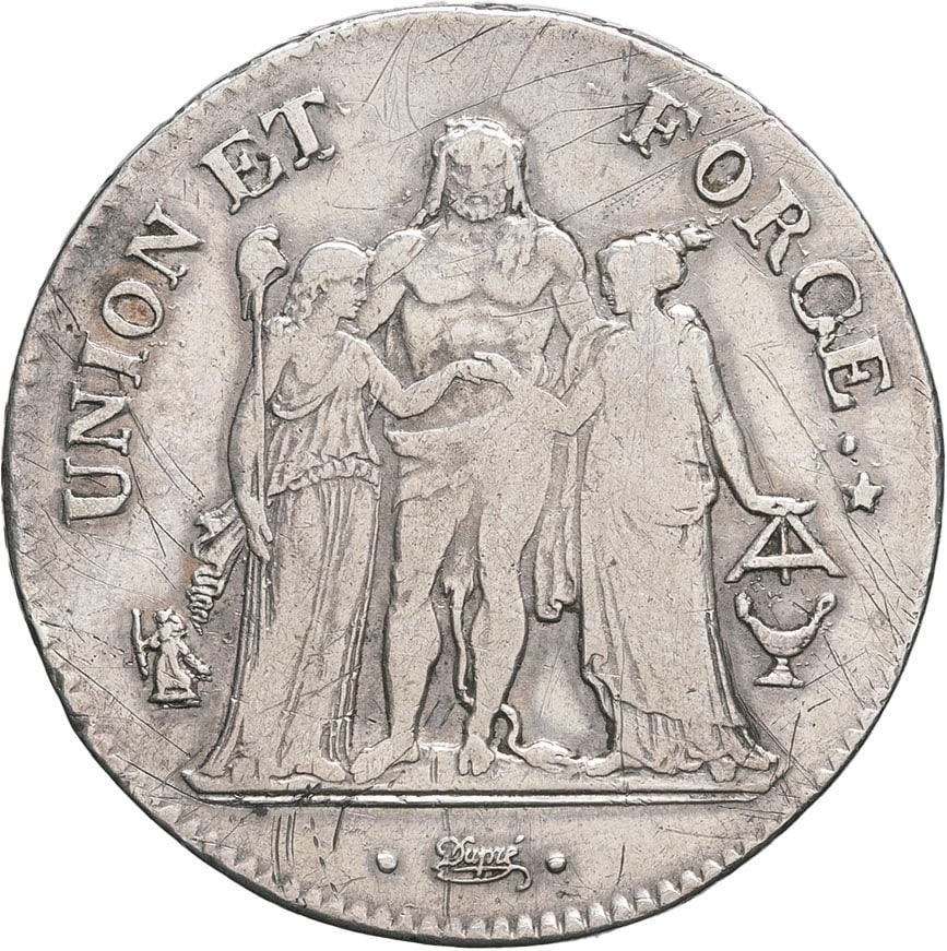 Av. UNION ET FORCE. Hercule debout de face avec la léonté, unissant la Liberté debout à gauche tenant une pique surmontée d’un bonnet de la liberté, et l’Égalité debout à droite, tenant le niveau. À l’exergue signature cursive Dupré.