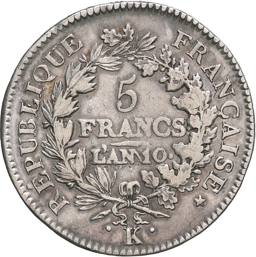 - Consulat (1799-1804). 5 francs Union et Force An 10 (1802), K, Bordeaux.