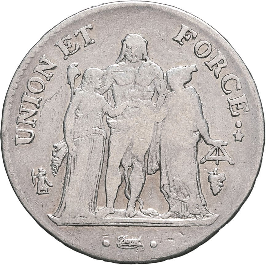 - Consulat (1799-1804). 5 francs Union et Force An 11 (1803), Q, Perpignan.