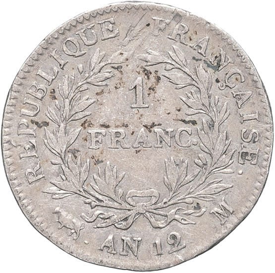 - Consulat (1799-1804). 1 franc Bonaparte An 12 (1804), M, Toulouse.