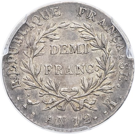 - Consulat (1799-1804). Demi-franc Bonaparte An 12 (1804), K, Bordeaux.