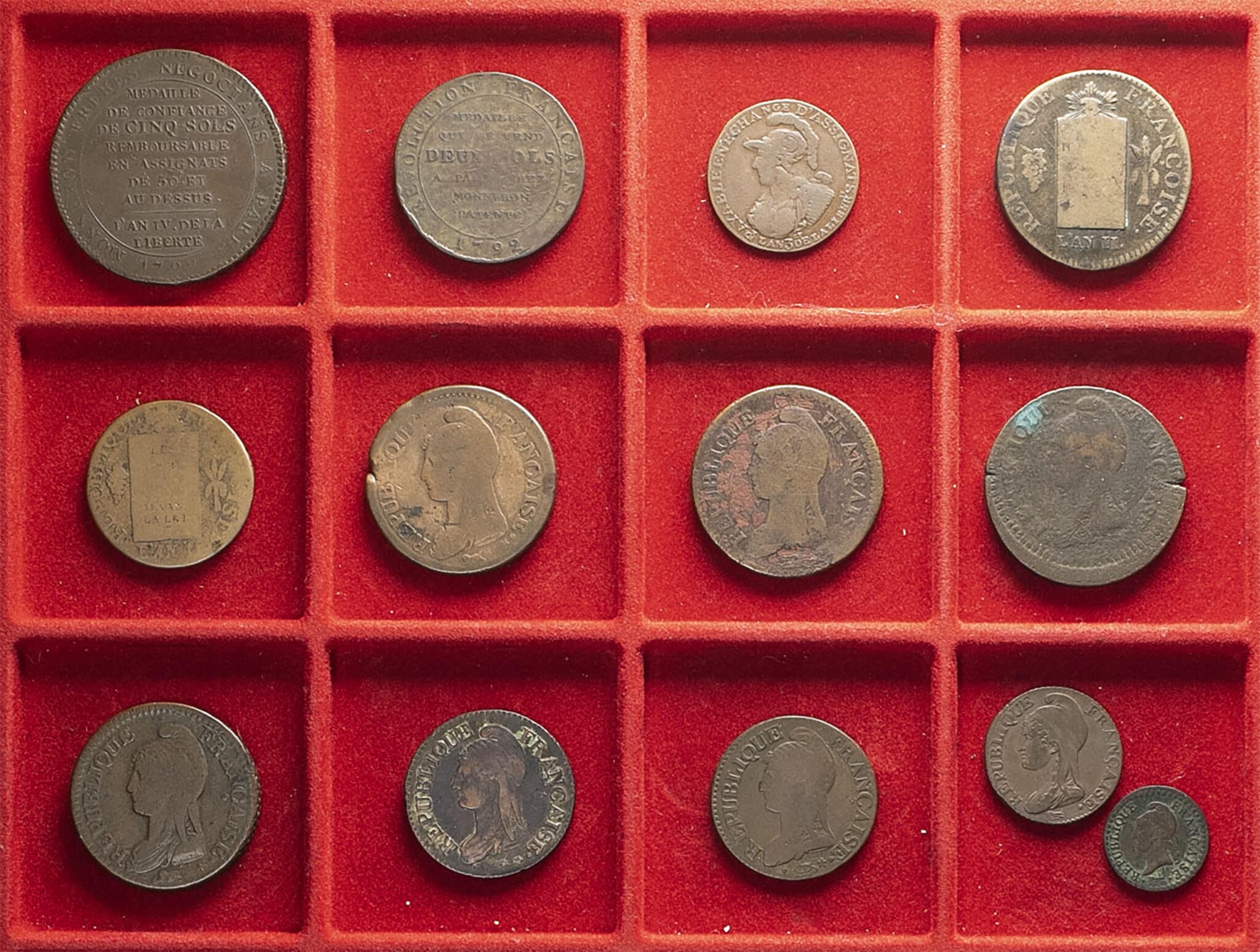 Ensemble comprenant 5 et 2 sols Monneron, 2 sols 6 deniers Caisse de Bonne Foy, 2 et 1 sols à la balance, 2 décimes, surfrappe et refrappe du 2 décimes, un décime, 5 centimes petit et grand module, un centime. B à TTB.