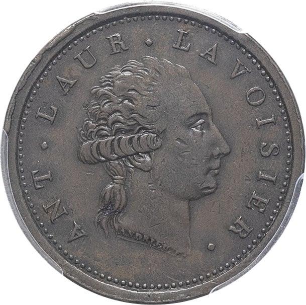 - Consulat (1799-1804). Essai de perfectionnement des monnaies par Gengembre, à l’effigie de Lavoisier, Frappe spéciale (SP) An 8 (1800), Paris.