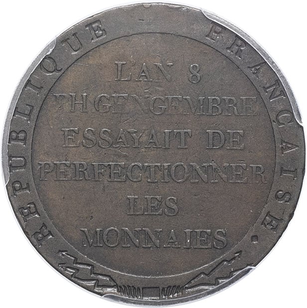 Rv. REPUBLIQUE FRANÇAISE et foudre sur le listel. Au centre, en six lignes : L'AN 8/ PH. GENGEMBRE/ ESSAYAIT DE/ PERFECTIONNER/ LES/ MONNAIES.
