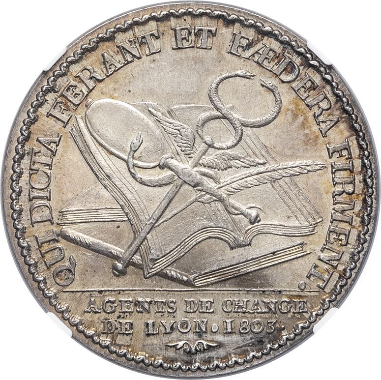 - Consulat (1799-1804). Jeton, agents de change de Lyon, par Mercier 1803 (refrappe postérieure), Paris.