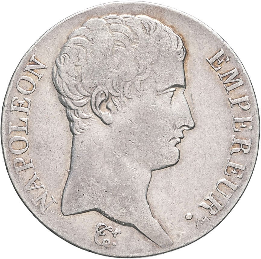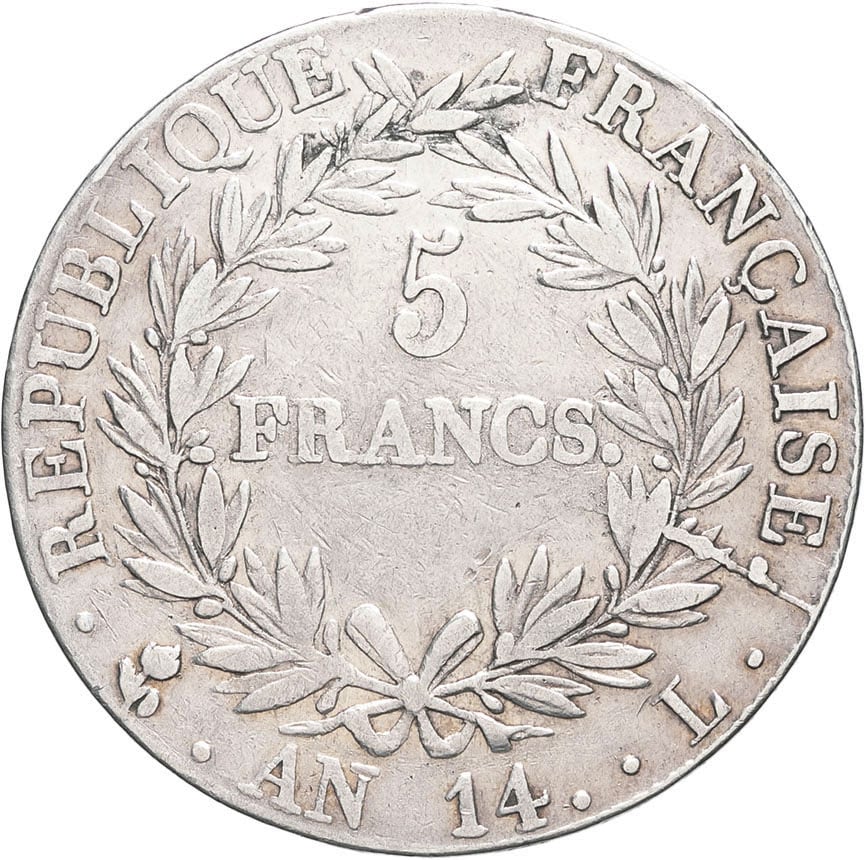 - Premier Empire / Napoléon Ier (1804-1814). 5 francs tête nue, calendrier révolutionnaire An 14 (1806), L, Bayonne.
