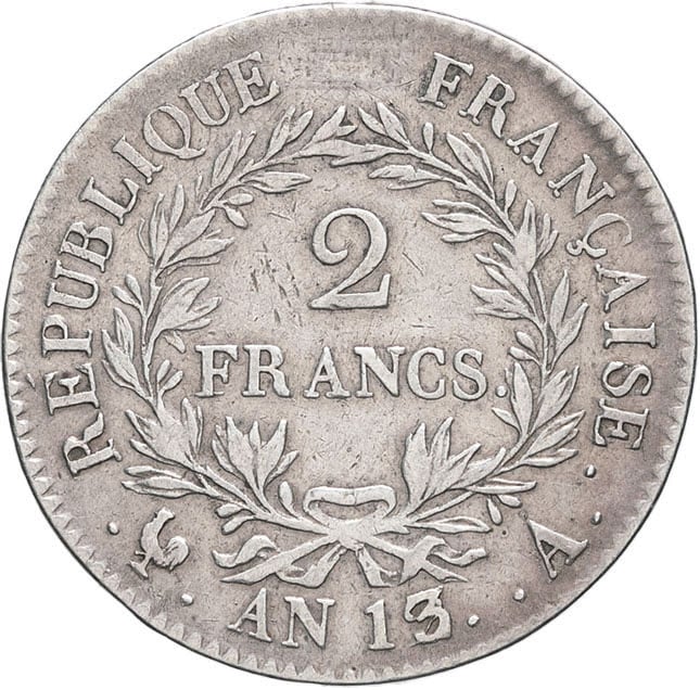 - Premier Empire / Napoléon Ier (1804-1814). 2 francs calendrier révolutionnaire An 13/12 (1805), A, Paris.