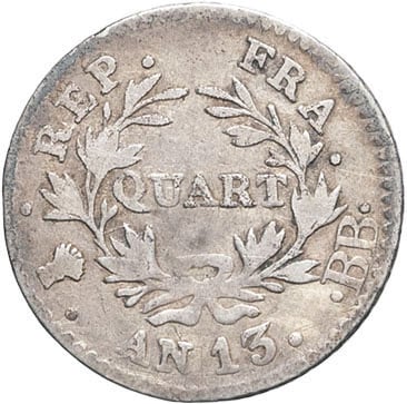 - Premier Empire / Napoléon Ier (1804-1814). Quart de franc calendrier révolutionnaire An 13 (1805), BB, Strasbourg.