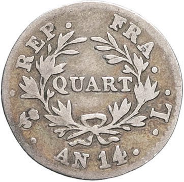 - Premier Empire / Napoléon Ier (1804-1814). Quart de franc calendrier révolutionnaire An 14 (1806), L, Bayonne.