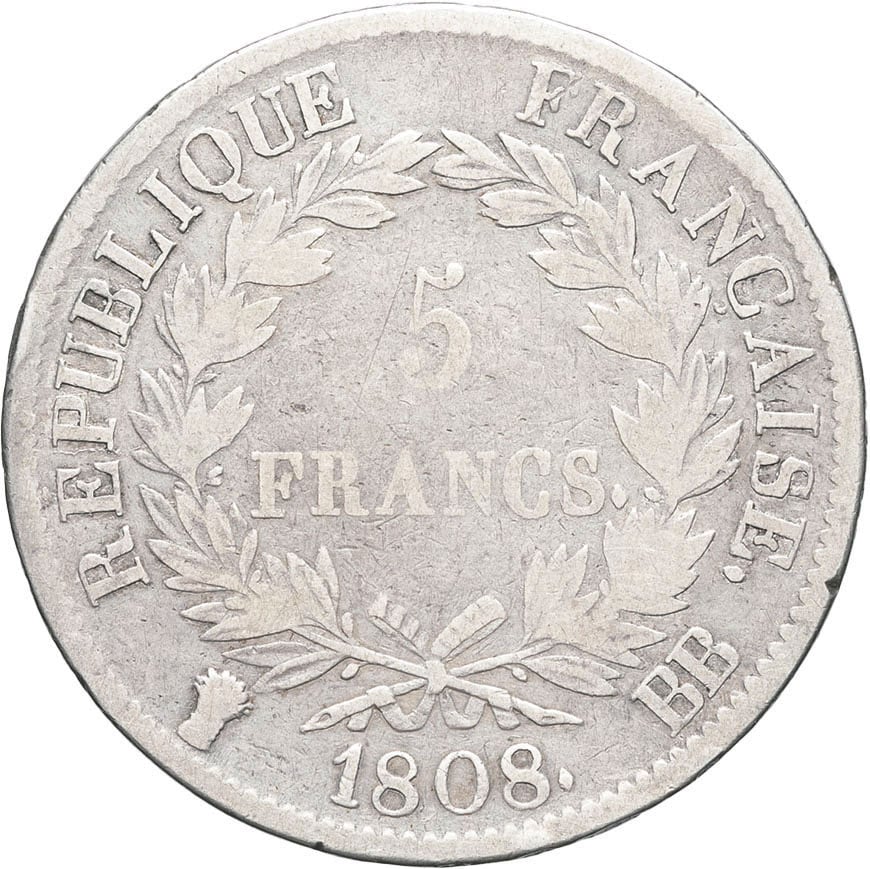 - Premier Empire / Napoléon Ier (1804-1814). 5 francs République 1808, BB, Strasbourg.