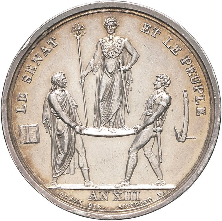 Rv. LE SENAT - ET LE PEUPLE. Napoléon debout sur un pavois, en costume de sacre, tenant un sceptre, le tout soutenu d'un côté par un sénateur avec les tables de la Loi et de l'autre un soldat avec un araire ; à l'exergue : AN XIII et signatures DENON DIR - ANDRIEU F.