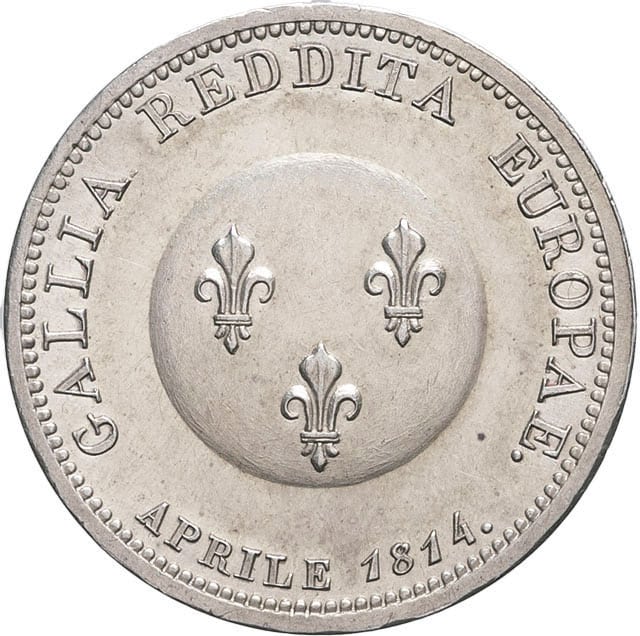 Av. GALLIA REDDITA EUROPAE. / APRILE 1814. Trois fleurs de lis dans un globe.