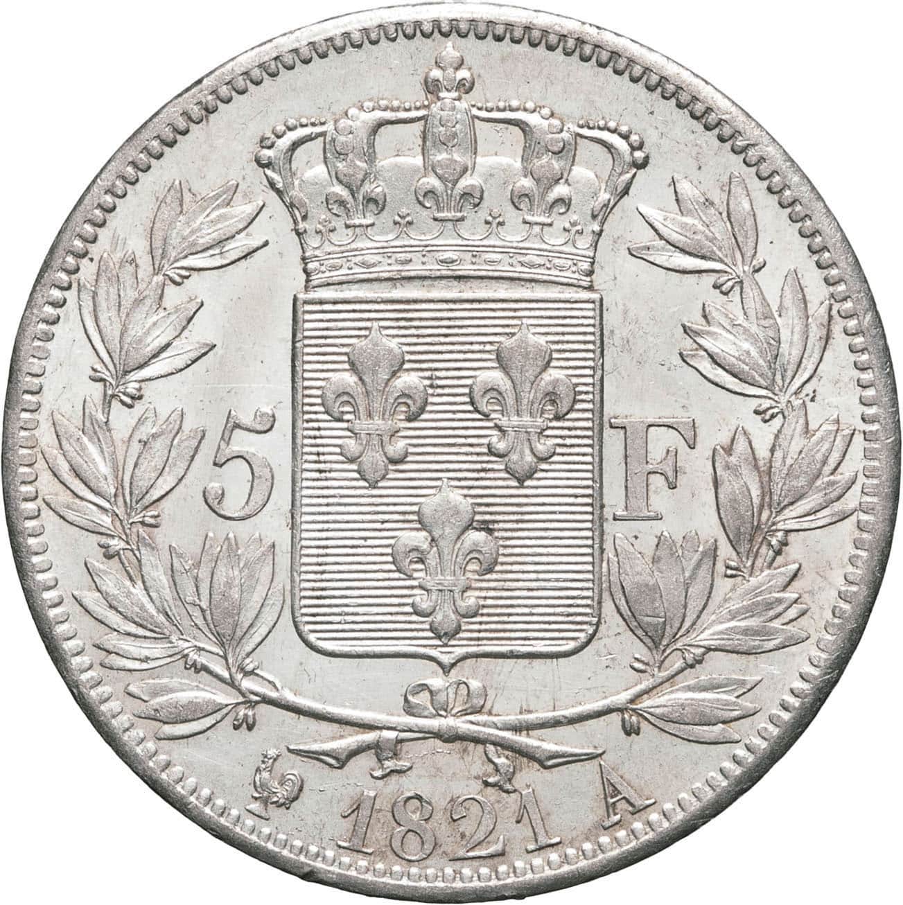 - Louis XVIII (1814-1824). 5 francs buste nu 1821, A, Paris.