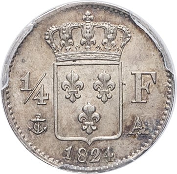 - Louis XVIII (1814-1824). 1/4 franc 1824, A, Paris.