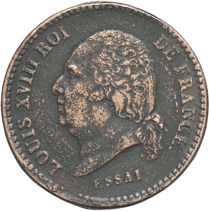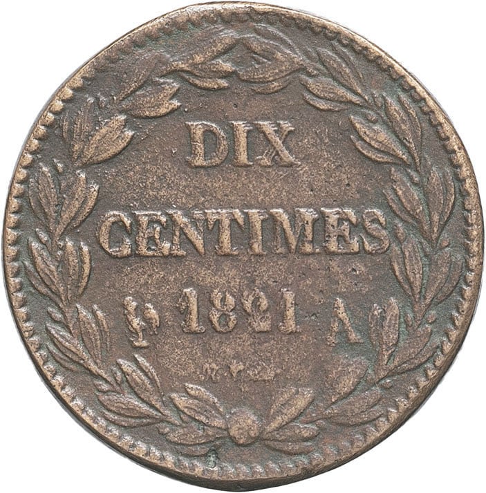 - Louis XVIII (1814-1824). Essai de dix centimes, premier revers 1821 (fonte postérieure).