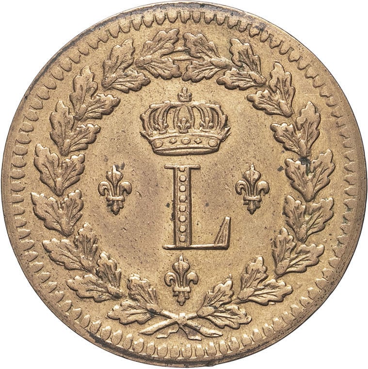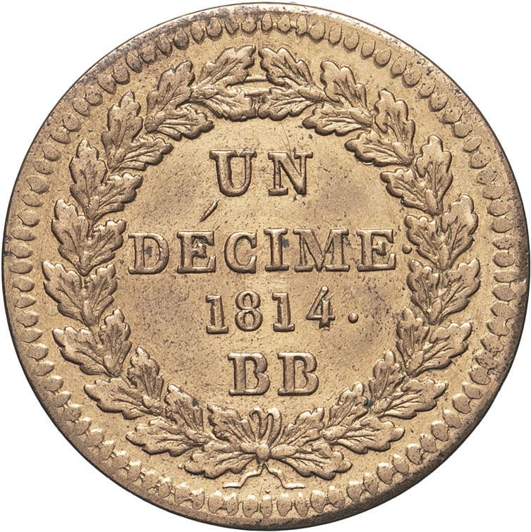 - Louis XVIII (1814-1824). Un décime à l’L couronnée, refrappe 1814, BB, Strasbourg.