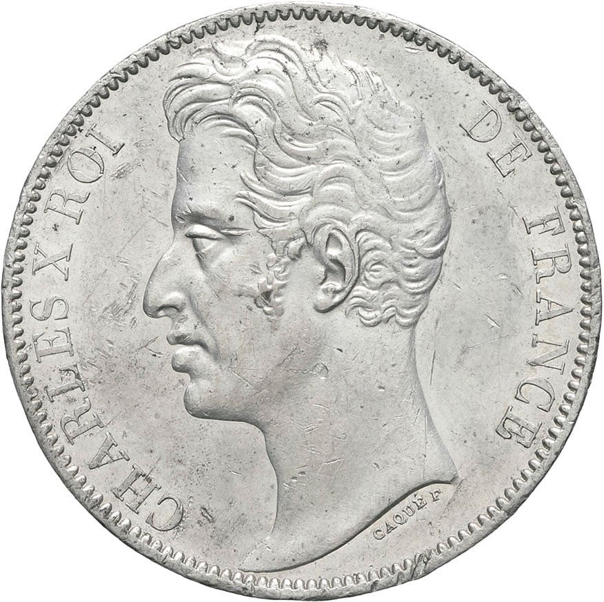 - Charles X (1824-1830). Essai uniface d’avers de 5 francs, concours de Caqué ND (1824-1825).