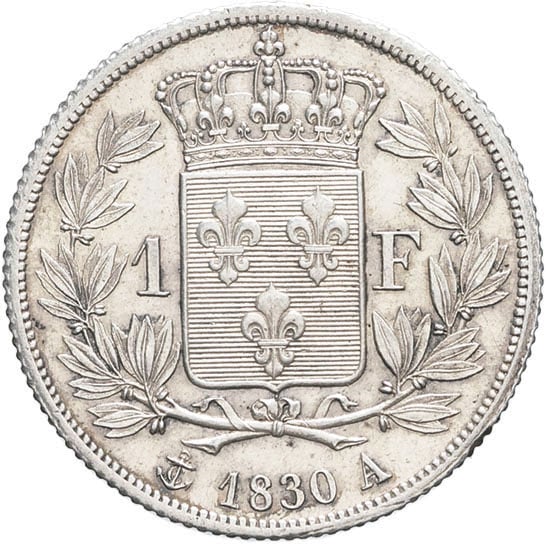 - Charles X (1824-1830). 1 franc, tranche cannelée (quatre feuilles) 1830, A, Paris.