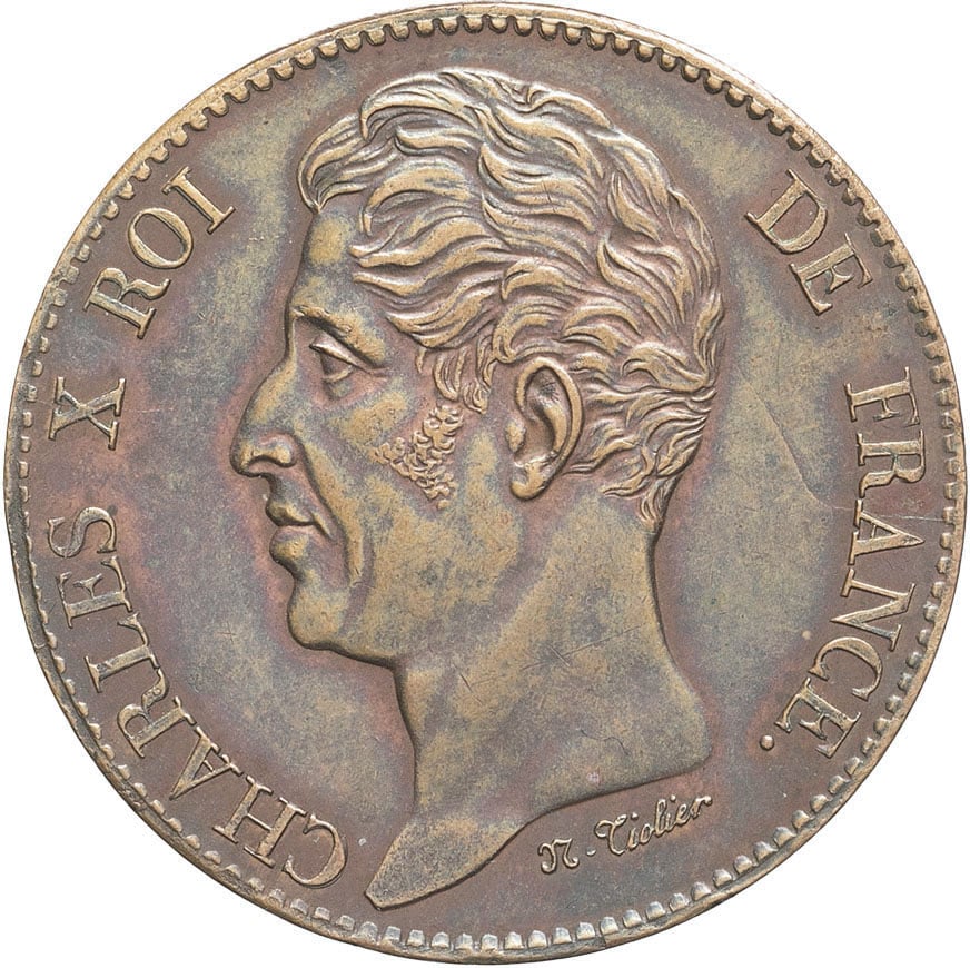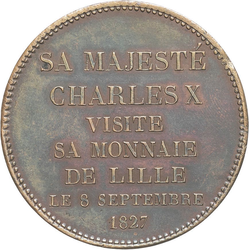 - Charles X (1824-1830). Module de 5 francs, visite de sa majesté Charles X à la Monnaie de Lille 1827, Lille.