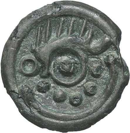 Rv. Sanglier à droite posé sur un annelet pointé central, un annelet en guise de queue ; dessous un torque pointé renfermant 5 globules.