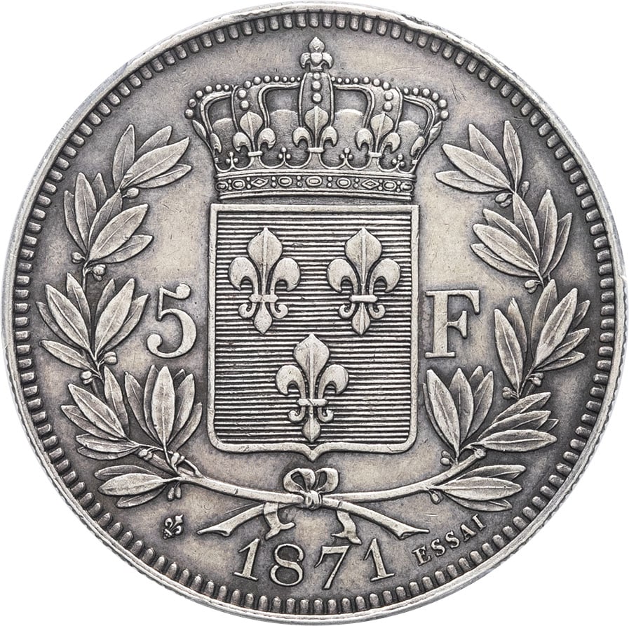 - Henri V (1820-1883). Essai de 5 francs par Capel, tranche cannelée, Frappe spéciale (SP) 1871, Bruxelles (Würden).