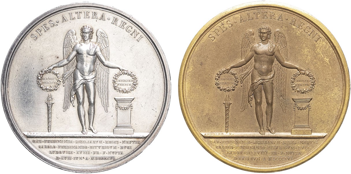 Rv. SPES. ALTERA. REGNI. Un ange de face tenant deux couronnes, l'une inscrite CAROLVS FERDIN au-dessus d'un flambeau, l'autre inscrite CAROLINA FERDIN au-dessus d'un autel ; à l'exergue : CAR. FERDINANDA. SICILIARVM. REG. NEPTIS./ CAROLO. FERDINANDO. BITVRIGVM. DVCI/ LVDOVICI. XVIII. FR. F. NVPTA/ D. XVII. IVN. A. MDCCCXVI.