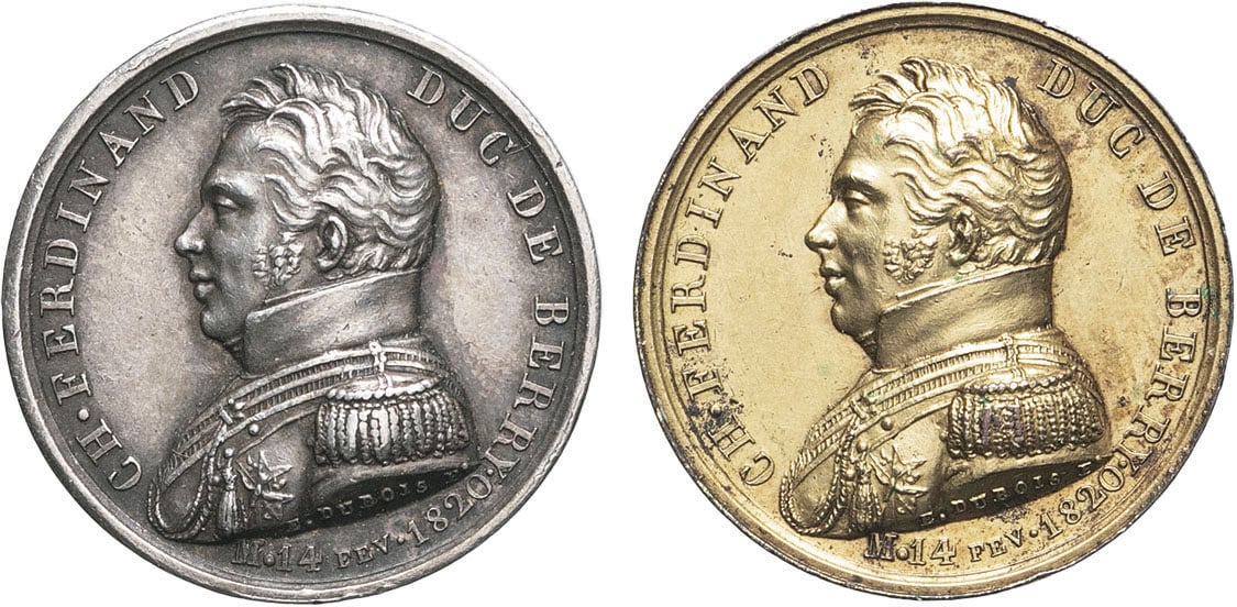 - Henri V (1820-1883). Paire de médailles, mort de Charles Ferdinand duc de Berry, par Dubois 1820.