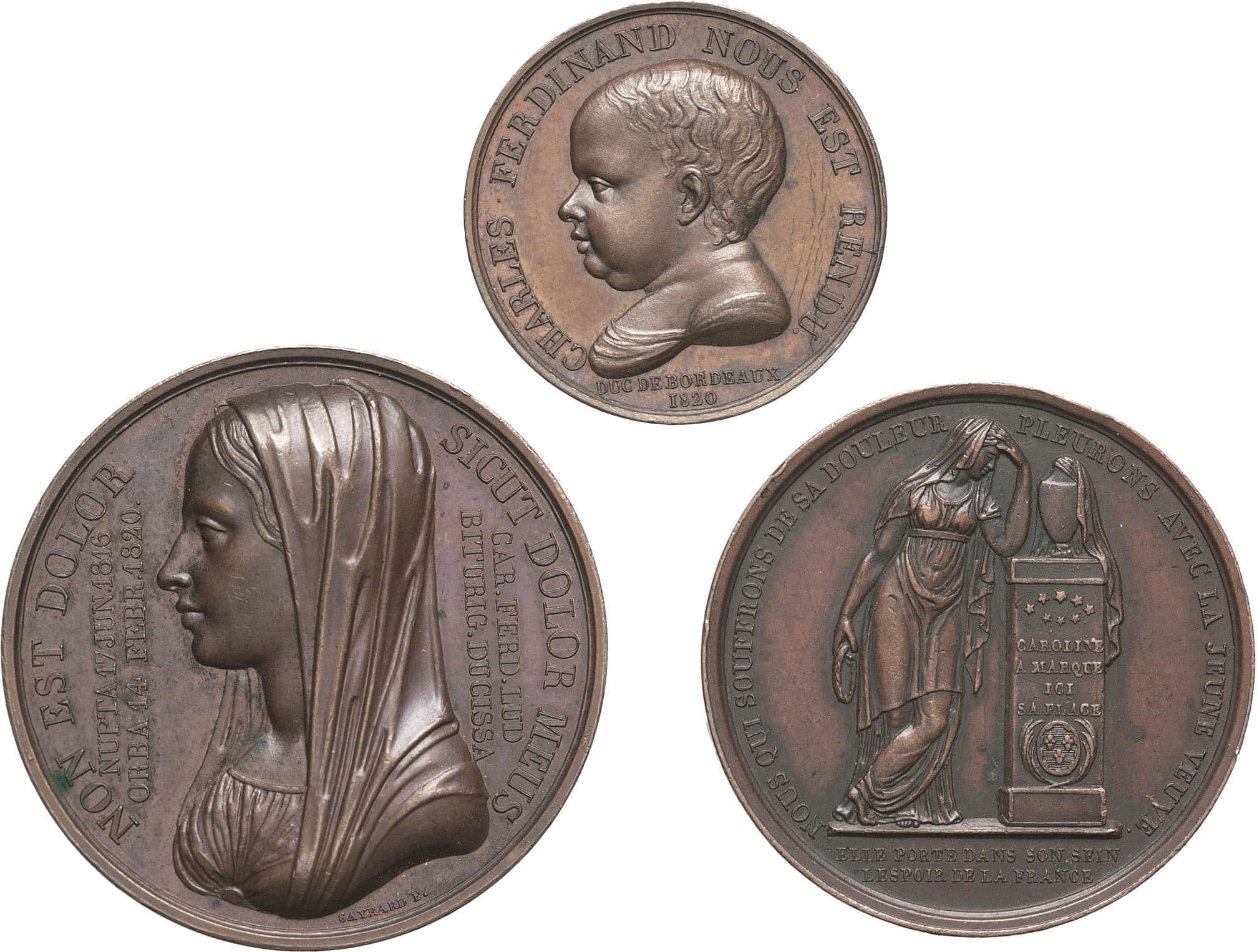 - Henri V (1820-1883). Ensemble de 3 médailles, mort de Charles Ferdinand duc de Berry et naissance d’Henri duc de Bordeaux, par Gayrard, Caqué et non signé par Barre 1820.