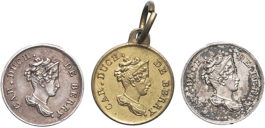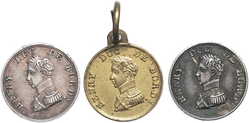- Henri V (1820-1883). Ensemble de 3 médaillettes, Henri duc de Bordeaux et sa mère Caroline duchesse de Berry ND (1830).