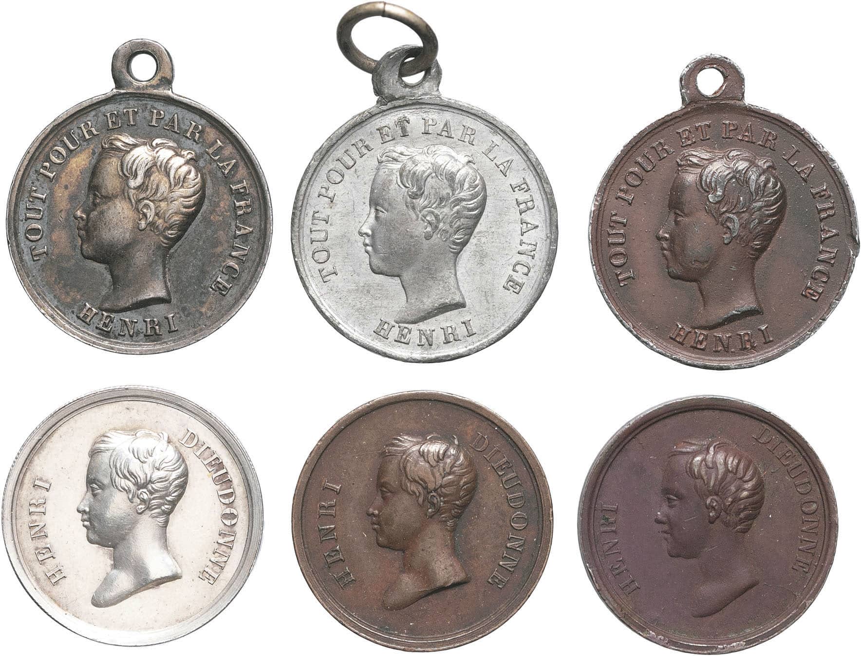 - Henri V (1820-1883). Ensemble de 6 médailles, Henri duc de Bordeaux, à la croix ancrée chargée d’un cœur ND (1830-1848).