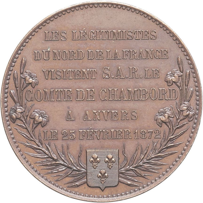 - Henri V (1820-1883). Médaille, Henri de France comte de Chambord, visite des légitimistes à Anvers 1872, Paris.
