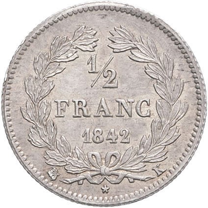 - Louis-Philippe Ier (1830-1848). 1/2 franc 1842, K, Bordeaux.