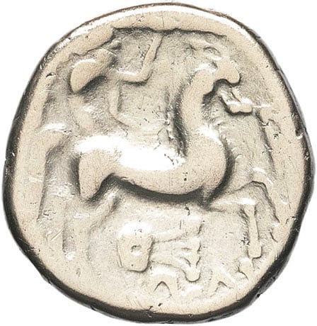 Av. Profil à droite, de tradition apollinienne, de composition proche des statères Vénètes où figure le système des cordons perlés à l’extrémité desquels on distingue de petits motifs palmés rappelant les têtes humaines. Lyre renversée en cimier.