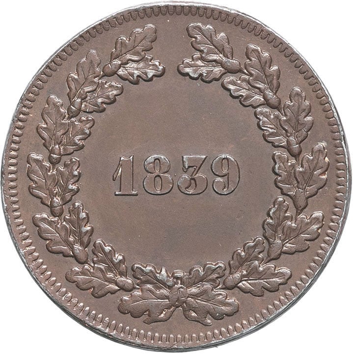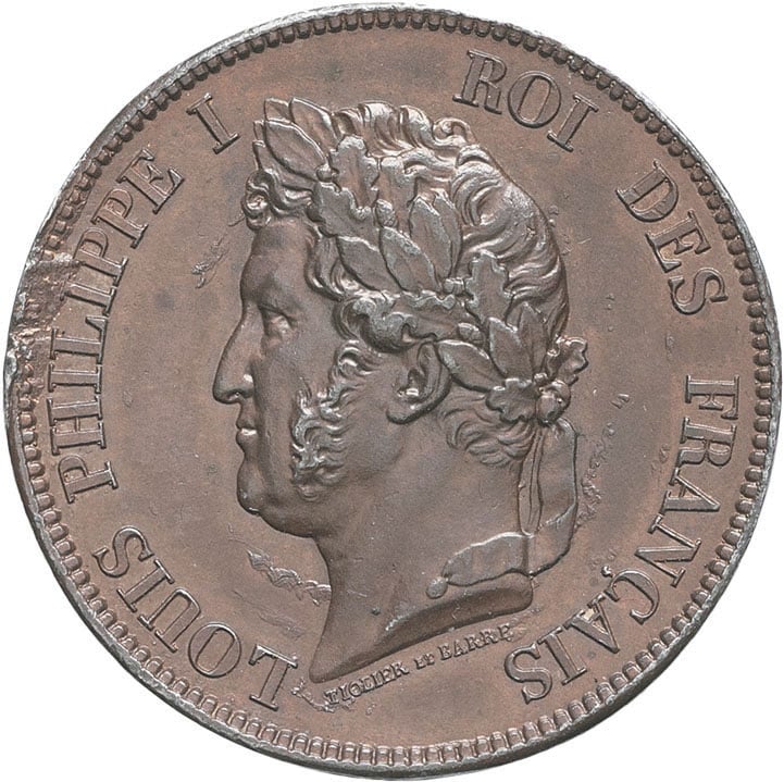 - Louis-Philippe Ier (1830-1848). Essai au module de 10 centimes, hybride type Londres 1839 (moulage postérieur).