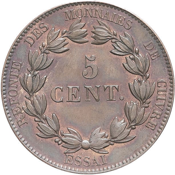 - Louis-Philippe Ier (1830-1848). Essai de 5 centimes, refonte des monnaies de cuivre ND (1840), Paris.