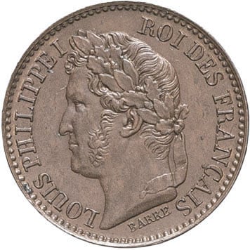 - Louis-Philippe Ier (1830-1848). Essai de 1 centime, refonte des monnaies de cuivre, par Barre ND (1840), Paris.