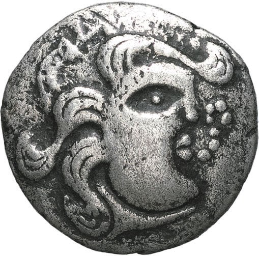 De style original, la tête massive, le nez épais (habituellement un simple trait) et l’œil profond, marqué d’un petit besant. Au revers, le vexillum est quadrillé horizontalement et verticalement (au lieu de diagonales). Patine noire dans les creux et légère porosité du métal. TTB.