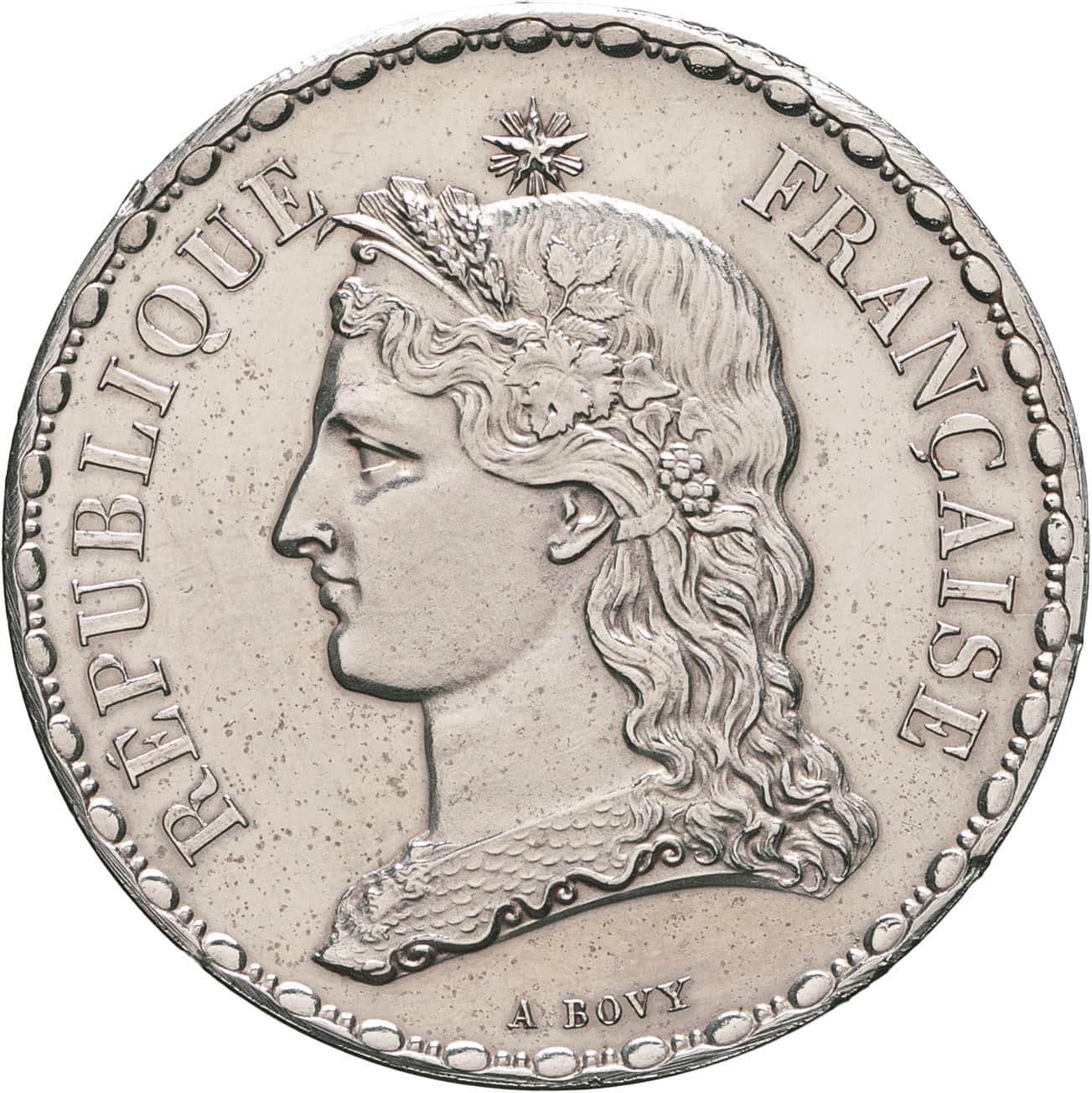 Av. REPUBLIQUE FRANÇAISE. Buste de la République à gauche, avec l’égide, coiffée d’une couronne agraire, sous une étoile ; au-dessous, signature A. BOVY.
