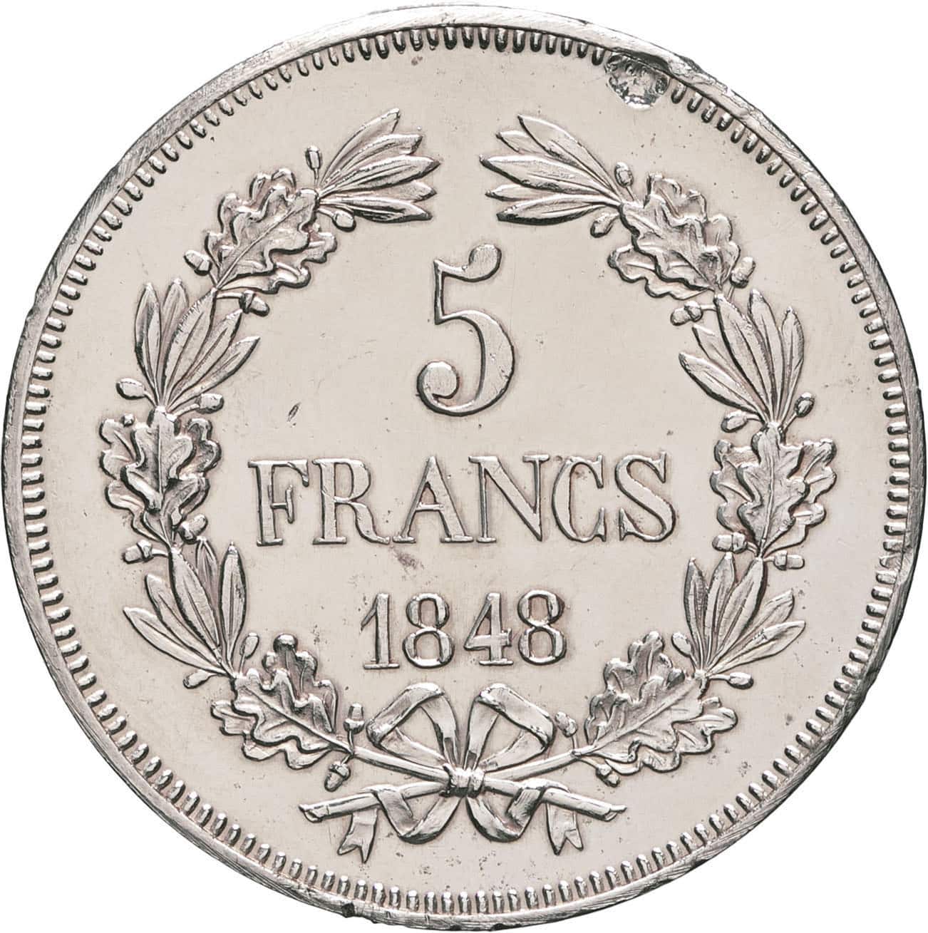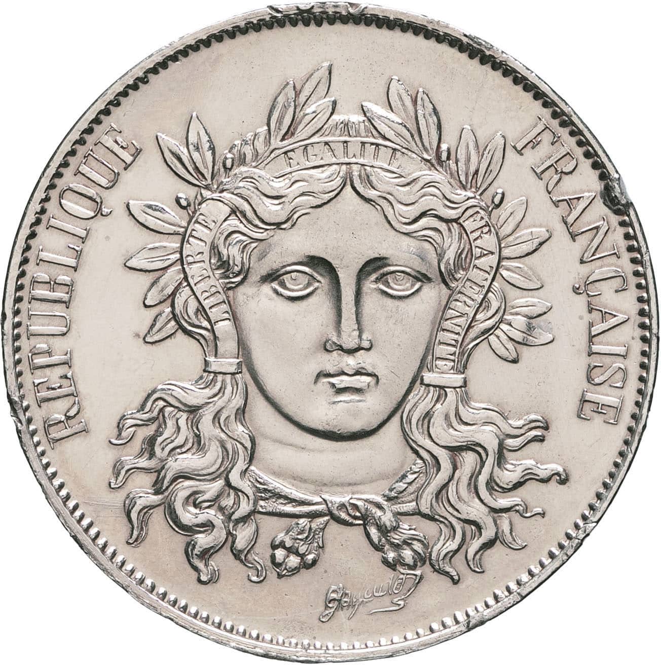 - IIe République (1848-1852). Essai de 5 francs, concours de 1848, 3e type de Gayrard 1848, Paris.