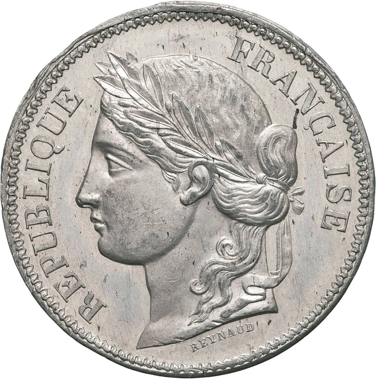 Av. RÉPUBLIQUE FRANÇAISE. Tête de la République à gauche, laurée d’olivier ; au-dessous signature REYNAUD.