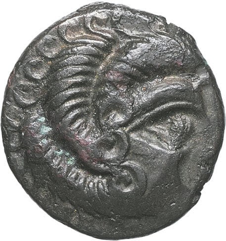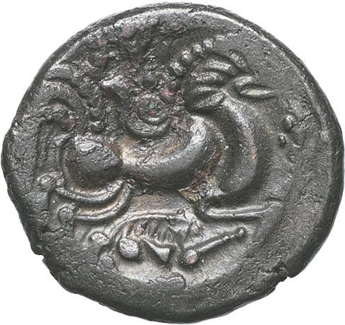 Rv. Cheval non androcéphale à droite, conduit par un aurige aviforme ; une volute part de la base de la crinière ; un sanglier à droite sous le cheval ; un rinceau devant le cheval.