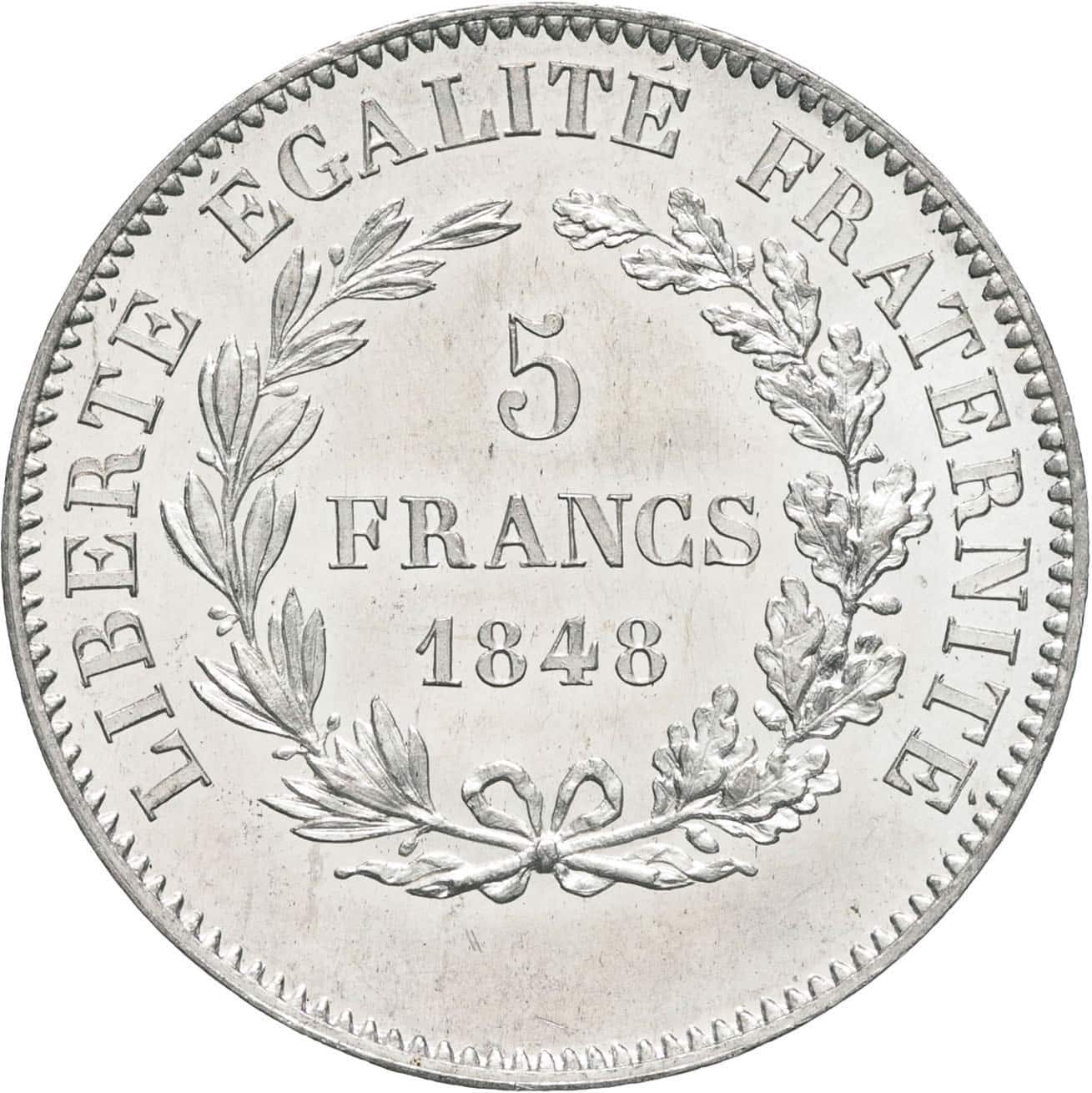 Rv. LIBERTÉ ÉGALITÉ FRATERNITÉ. Dans une couronne formée d’une branche de chêne et d’une branche de laurier : 5 FRANCS (date).