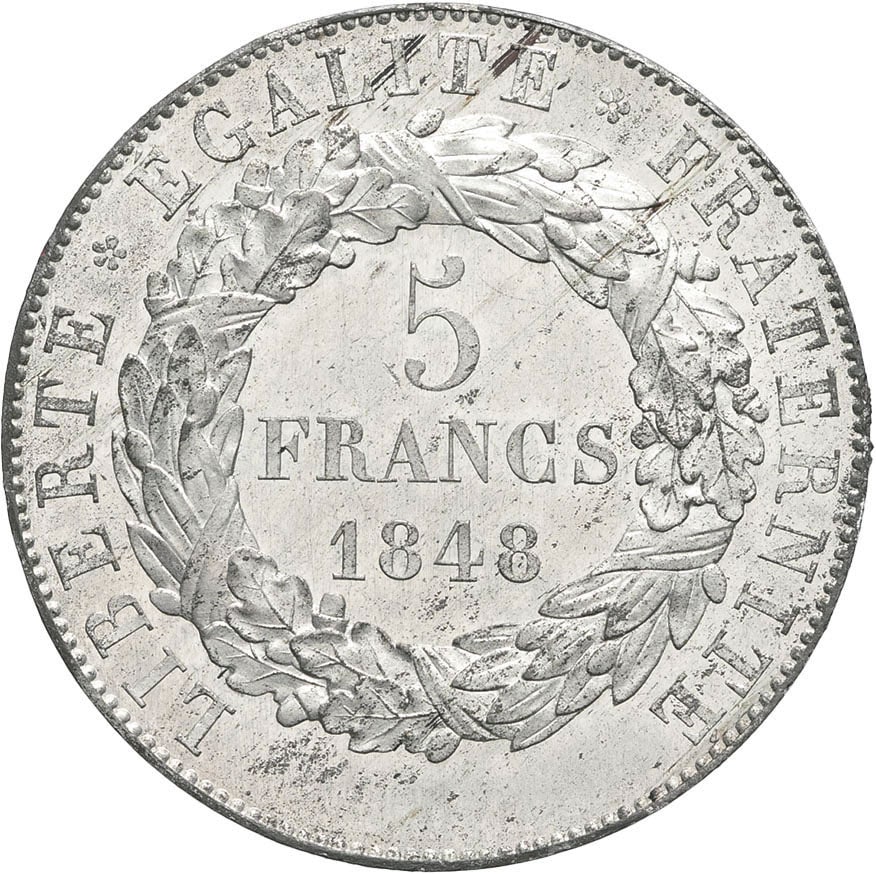 - IIe République (1848-1852). Essai de 5 francs, concours de 1848, par Vauthier-Galle 1848, Paris.