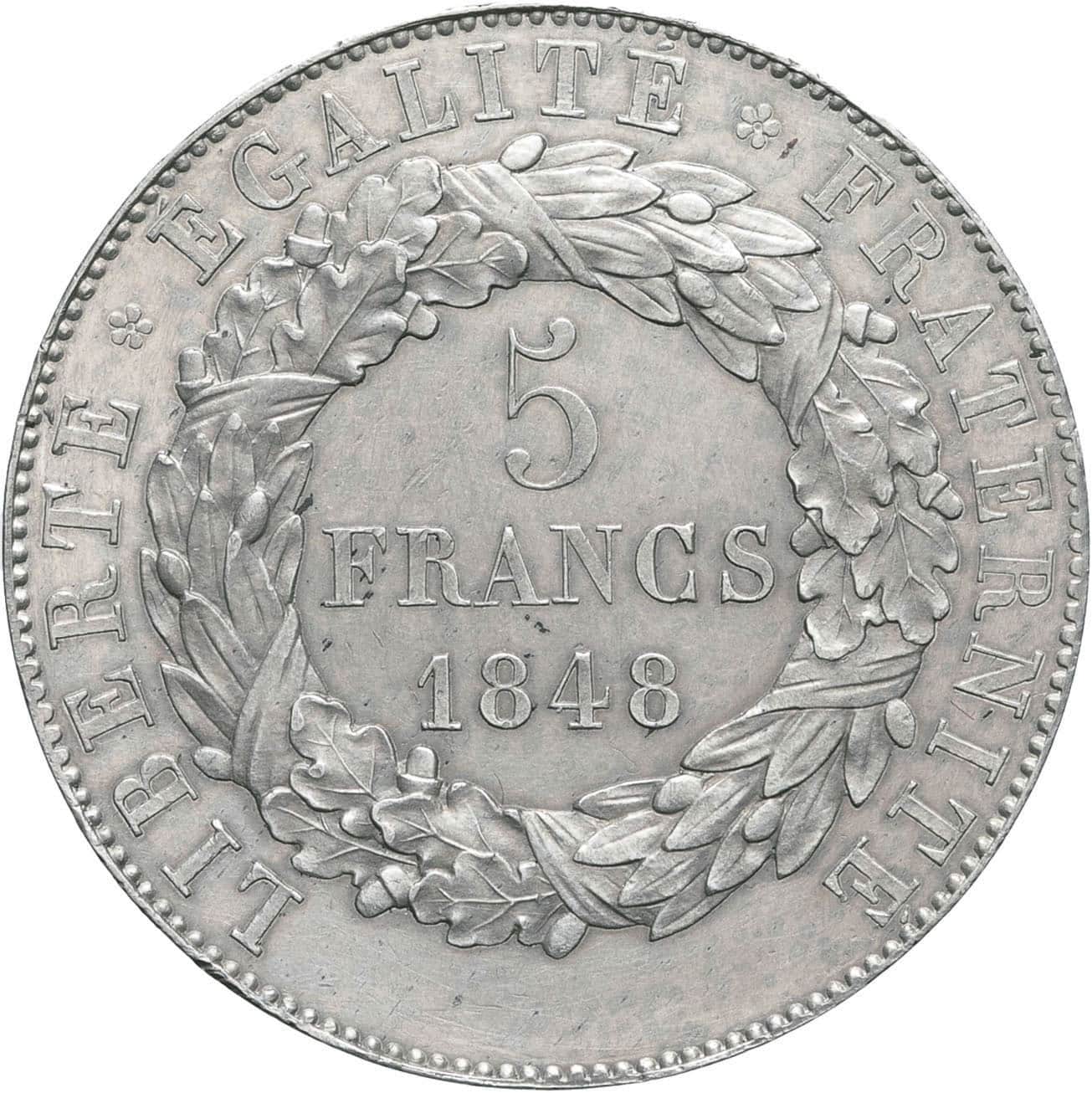 Rv. LIBERTÉ * ÉGALITÉ * FRATERNITÉ. Dans une couronne formée d’une branche de chêne et d’une branche de laurier : 5 FRANCS (date).
