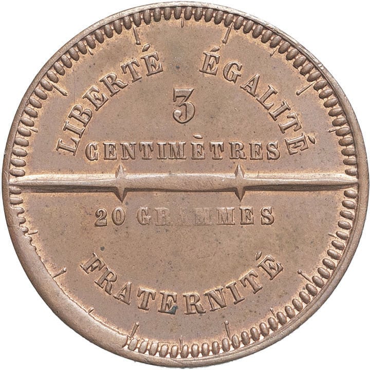 Rv. LIBERTÉ ÉGALITÉ / FRATERNITÉ. Au centre, règle surmontée de 3 CENTIMÈTRES et au-dessous 20 GRAMMES.