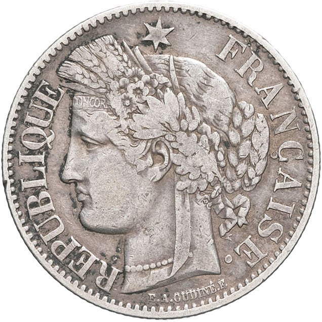 Av. RÉPUBLIQUE FRANÇAISE. Tête de la République à gauche en Cérès, sous une étoile, au-dessous signature E. A. OUDINÉ. F.