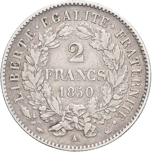 - IIe République (1848-1852). 2 francs Cérès 1850, A, Paris.