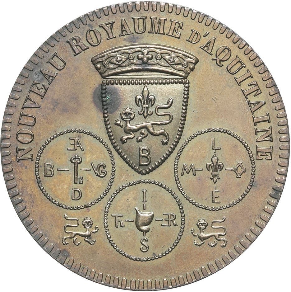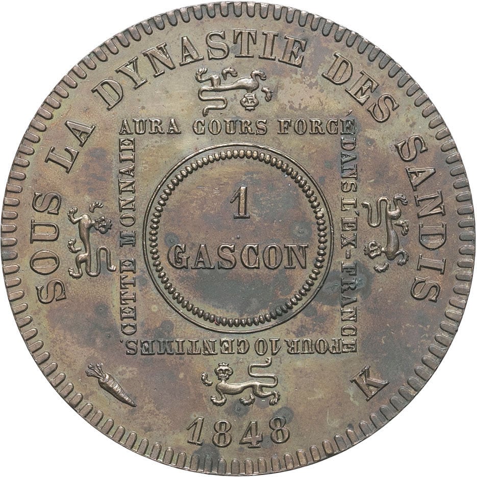 - IIe République (1848-1852). Module de 5 francs, 1 gascon ou 10 centimes, nouveau royaume d’Aquitaine, dynastie des Sandis, par Henri Fonfrède 1848, K, Bordeaux ?
