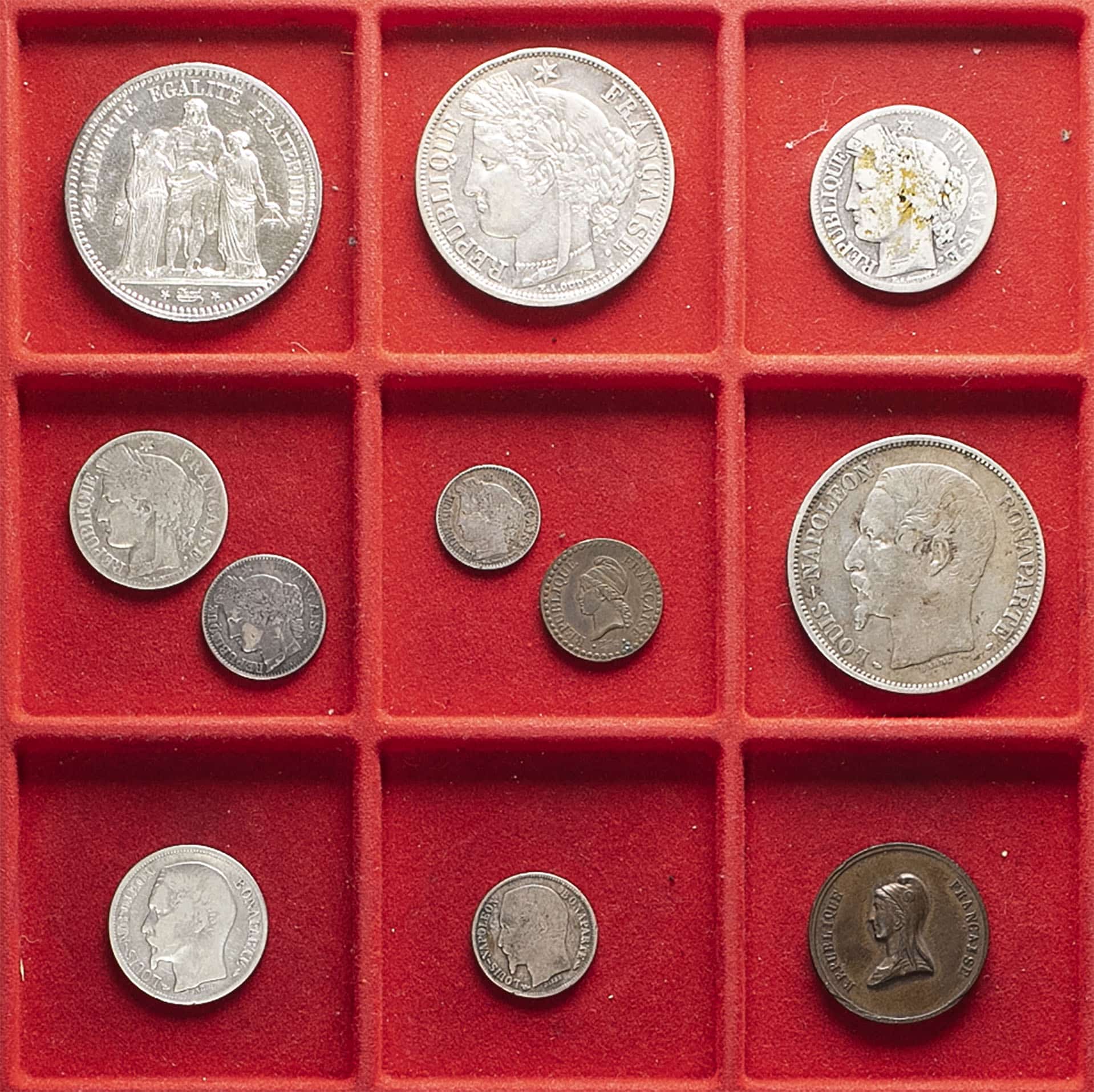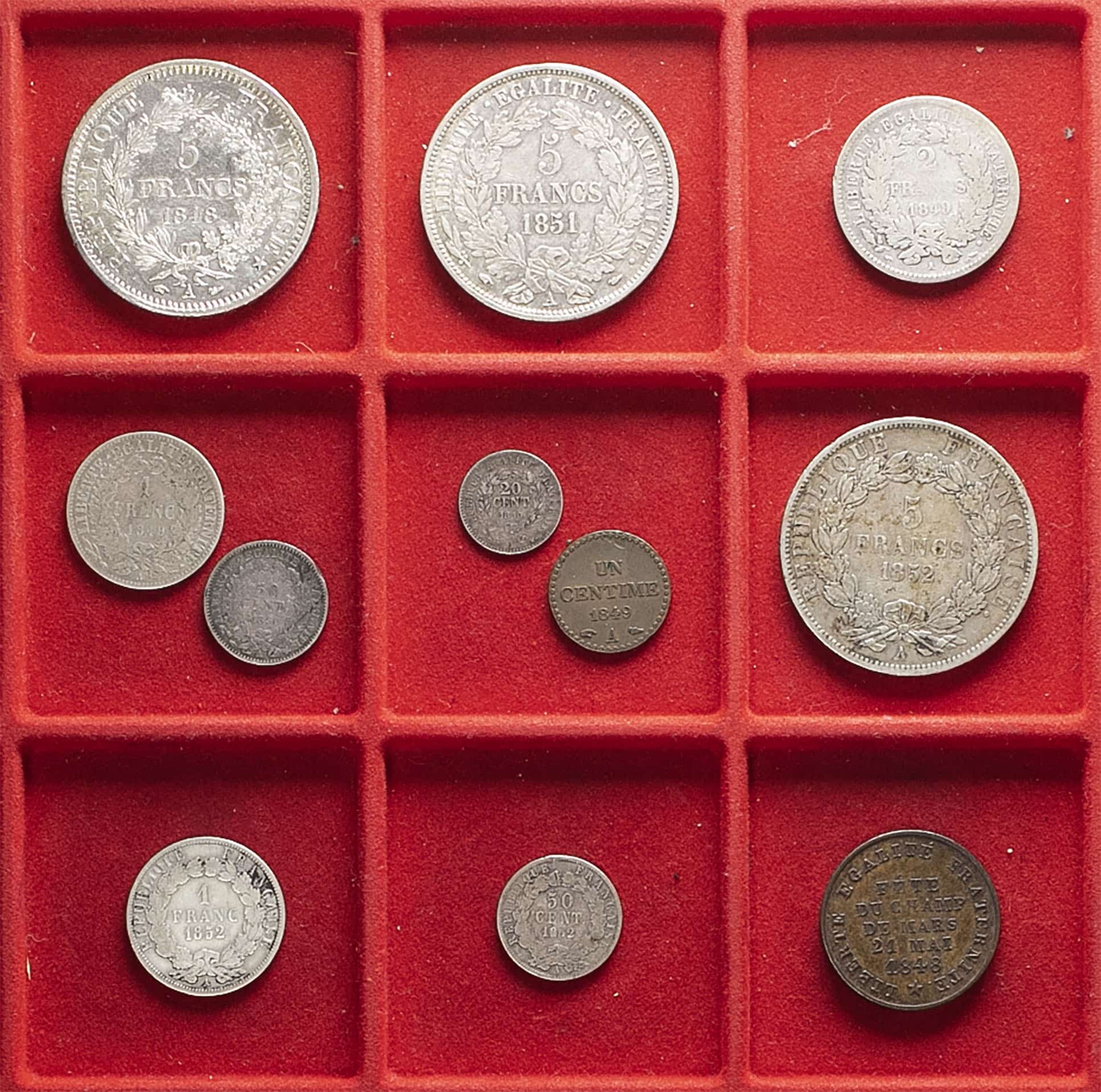 Ensemble composé d’une 5 francs Hercule, d’une série de 20 centimes à 5 francs Cérès, un centime Dupré, 50 centimes, 1 franc et 5 francs Louis-Napoléon Bonaparte et d’une médaille pour la fête du champ de mars. TB à Superbe.