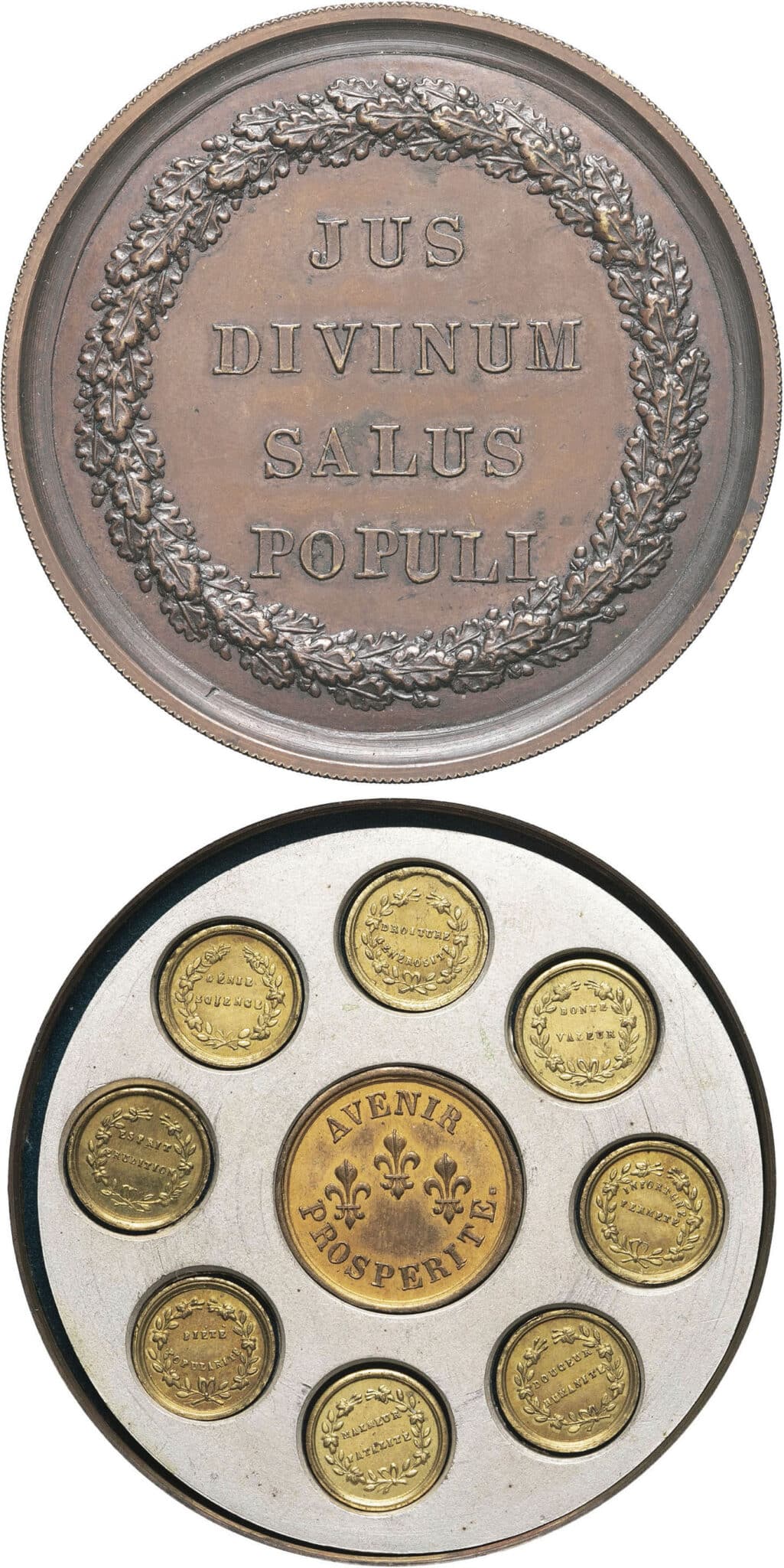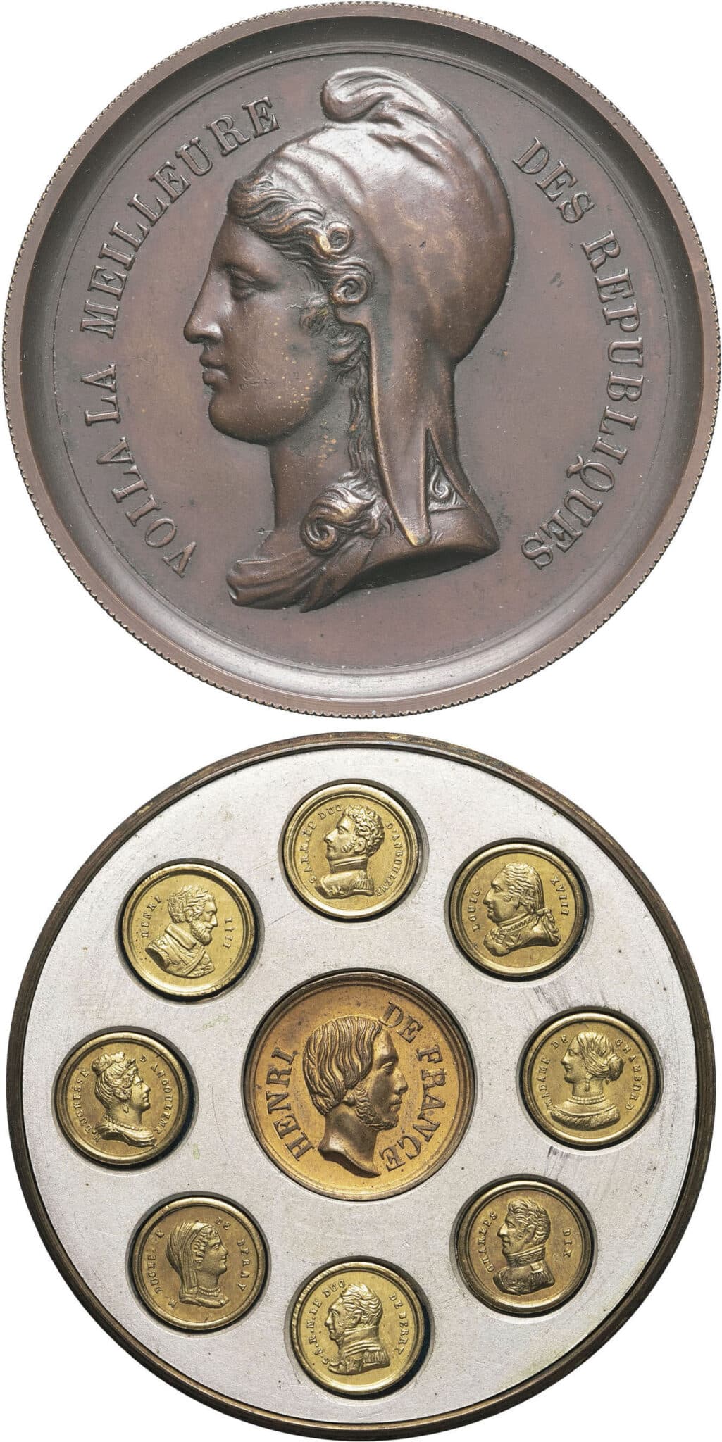 Médaille-boîte à l'effigie de la République, renfermant 9 médaillettes aux portraits d'Henri V (avenir prospérité), Henri IV (bonté valeur), Louis XVIII (génie science), Charles X (piété popularité), le duc et la duchesse d'Angoulême (droiture générosité / infortune fermeté), le duc et la duchesse du Berry (malheur fatalité / douceur humanité) et madame de Chambord (esprit érudition).